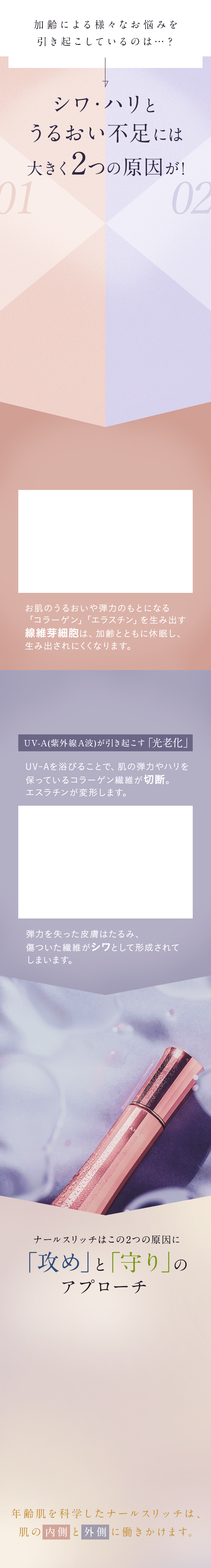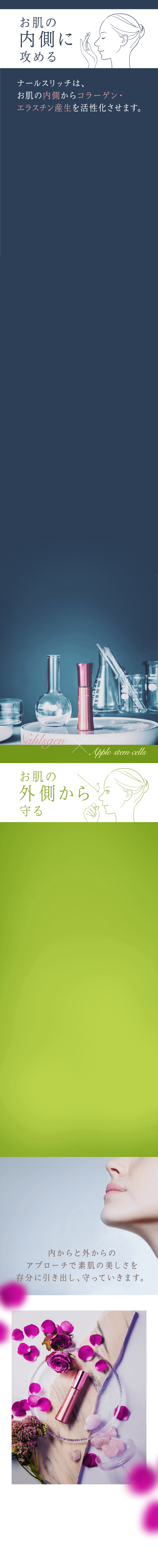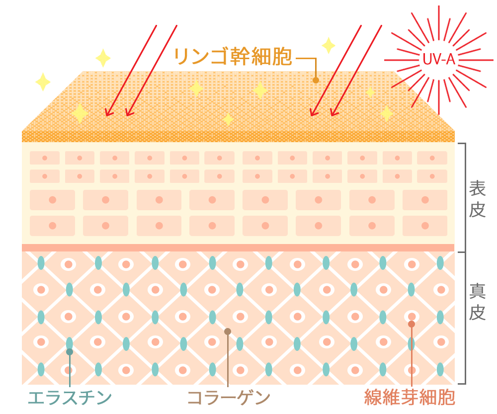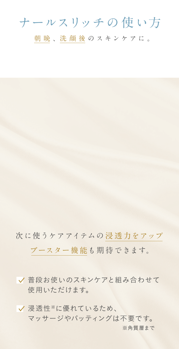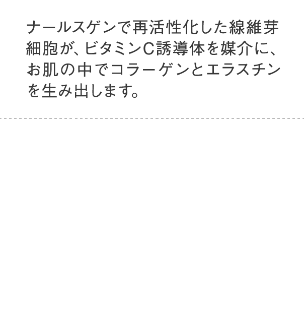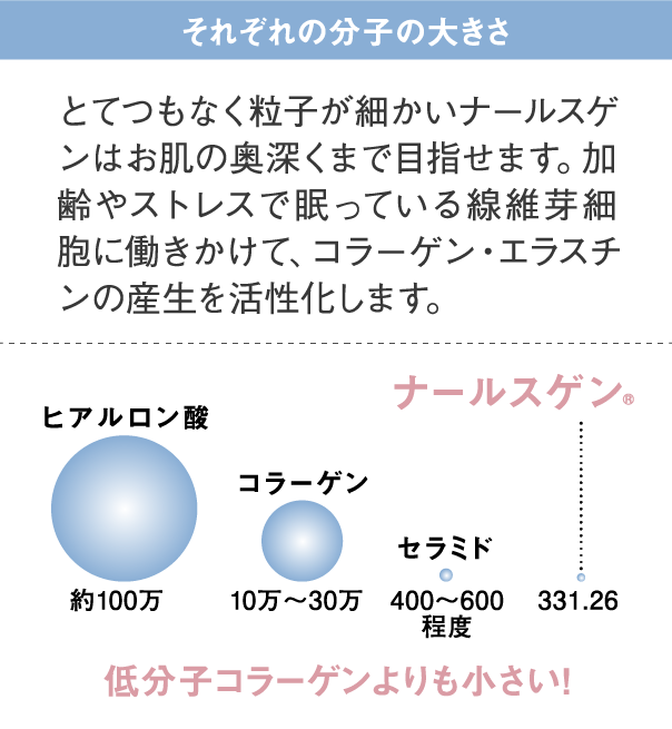 ナールスゲンは、コラーゲンを作る線維芽細胞に働きかけるという点が大きく違います。また粒子が大変細かく、角質層の奥まで届くのも特徴です。